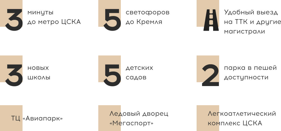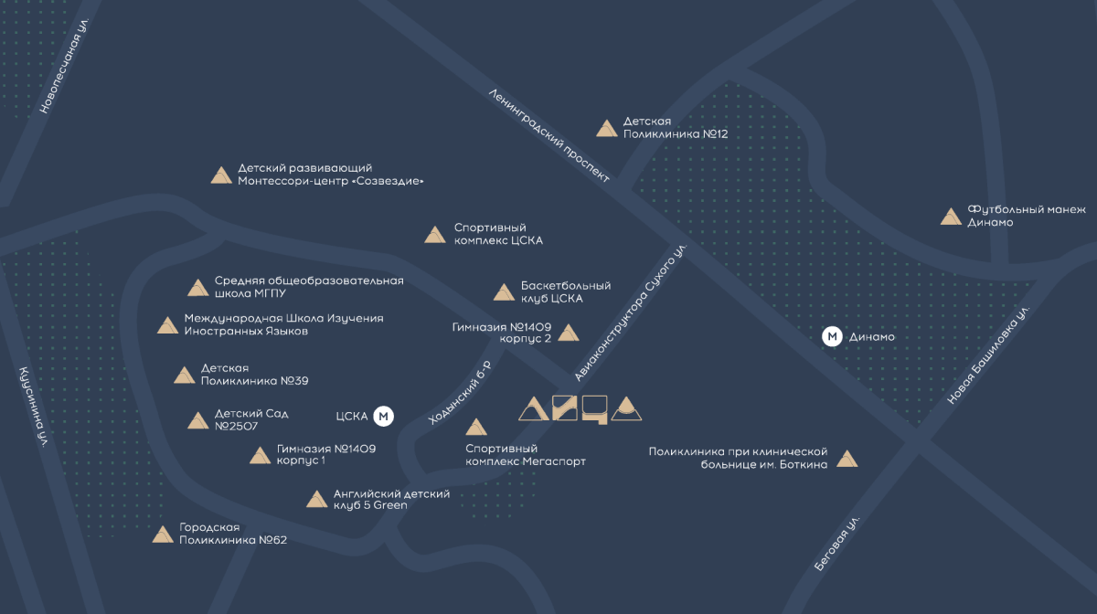 | «ЛИЦА» всегда находятся в выгодном положении благодаря своей локации: в трех минутах от станции метро ЦСКА, до делового центра «Москва-Сити» всего 10 минут, и 15 минут — до исторического центра города. Однако Ходынку любят не только за транспортную доступность, но и за развитую инфраструктуру: два парка у дома, дворцы спорта и школы чемпионов. |